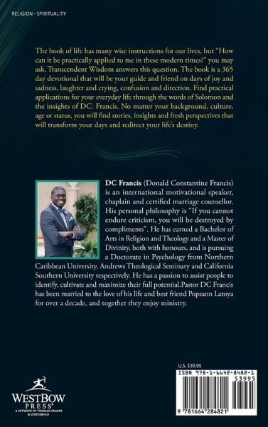 The book of life has many wise instructions for our lives, but "How can it be practically applied to me in these modern times?" you may ask. Transcendent Wisdom answers this question. The book is a 365 day devotional that will be your guide and friend on days of joy and sadness, laughter and crying, confusion and direction. Find practical applications for your everyday life through the words of Solomon and the insights of DC. Francis. No matter your background, culture, age or status, you will find stories, insights and fresh perspectives that will transform your days and redirect your life's destiny.