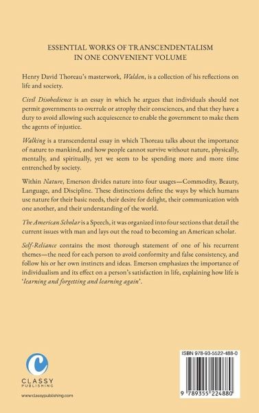 ESSENTIAL WORKS OF TRANSCENDENTALISM IN ONE CONVENIENT VOLUME Henry David Thoreau's masterwork, Walden, is a collection of his reflections on life and society. Civil Disobedience is an essay in which he argues that individuals should not permit governments to overrule or atrophy their consciences, and that they have a duty to avoid allowing such acquiescence to enable the government to make them the agents of injustice. Walking is a transcendental essay in which Thoreau talks about the importance of nature to mankind, and how people cannot survive without nature, physically, mentally, and spiritually, yet we seem to be spending more and more time entrenched by society. Within Nature, Emerson divides nature into four usages-Commodity, Beauty, Language, and Discipline. These distinctions define the ways by which humans use nature for their basic needs, their desire for delight, their communication with one another, and their understanding of the world. The American Scholar is a Speech, it was organized into four sections that detail the current issues with man and lays out the road to becoming an American scholar. Self-Reliance contains the most thorough statement of one of his recurrent themes-the need for each person to avoid conformity and false consistency, and follow his or her own instincts and ideas. Emerson emphasizes the importance of individualism and its effect on a person's satisfaction in life, explaining how life is 'learning and forgetting and learning again'.