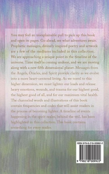 Prophetic messages, divinely inspired poetry and artwork are a few of the mediums included in this collection. We are approaching a unique point in the timeline of the universe. Time itself is coming undone, and we are moving along with a new fifth dimensional planet. Messages from the Angels, Oracles, and Spirit provide clarity as we evolve into a more heart-centered living. As we travel to this higher dimension, we must lighten our loads and release heavy emotions, wounds, and trauma for our highest good, the highest good of all, and for our maximum vital health. The channeled words and illustrations of this book contain frequencies and codes that will assist readers in the process of becoming lighter. A timeline of events happening in the spirit realm, behind the veil, has been highlighted in this collection. This book contains something for every reader.