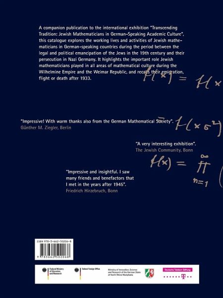 A companion publication to the international exhibition "Transcending Tradition: Jewish Mathematicians in German-Speaking Academic Culture", the catalogue explores the working lives and activities of Jewish mathematicians in German-speaking countries during the period between the legal and political emancipation of the Jews in the 19th century and their persecution in Nazi Germany. It highlights the important role Jewish mathematicians played in all areas of mathematical culture during the Wilhelmine Empire and the Weimar Republic, and recalls their emigration, flight or death after 1933.