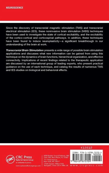 Since the discovery of transcranial magnetic stimulation (TMS) and transcranial electrical stimulation (tES), these non-invasive brain stimulation (NIBS) techniques have been used to investigate the state of cortical excitability, and the excitability of the cortico-cortical and corticospinal pathways. In addition, these techniques have been found to induce neuroplasticity-a significant breakthrough in our understanding of the brain at work. Transcranial Brain Stimulation presents a wide range of possible brain stimulation applications and discusses what new information can be gained from using this technique on the dynamics of brain functions, hierarchical organization, and effective connectivity. Implications of recent findings related to the therapeutic application are discussed by an international group of leading experts, who present practical guidance on the use of each technique, and catalog the results of numerous TMS and tES studies on biological and behavioral effects.