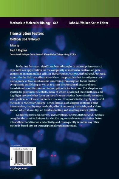 Transcription Factor Trafficking and Post-translational Modifications: Overviews of Mechanisms.- A Review of Post-translational Modifications and Subcellular Localization of Ets Transcription Factors: Possible Connection with Cancer and Involvement in the Hypoxic Response.- Regulation of Transcription Factor Function by Targeted Protein Degradation: An Overview Focusing on p53, c-Myc, and c-Jun.- Review of Molecular Mechanisms Involved in the Activation of the Nrf2-ARE Signaling Pathway by Chemopreventive Agents.- Cytoplasmic-Nuclear Trafficking of Transcription Factors.- Subnuclear Localization and Intranuclear Trafficking of Transcription Factors.- Analysis of Ligand-Dependent Nuclear Accumulation of Smads in TGF-? Signaling.- Raf/MEK/MAPK Signaling Stimulates the Nuclear Translocation and Transactivating Activity of FOXM1.- Coupling of Dephosphorylation and Nuclear Export of Smads in TGF-? Signaling.- Assessing Sequence-Specific DNA Binding and Transcriptional Activity of STAT1 Transcription Factor.- Analysis of Nuclear Export Using Photoactivatable GFP Fusion Proteins and Interspecies Heterokaryons.- Determination of Nuclear Localization Signal Sequences for Krüppel-Like Factor 8.- Methods to Measure Nuclear Export of ?-Catenin Using Fixed and Live Cell Assays.- Imaging of Transcription Factor Trafficking in Living Cells: Lessons from Corticosteroid Receptor Dynamics.- Post-translational Modifications and Impact on Function.- Hypoxia-Inducible Factors: Post-translational Crosstalk of Signaling Pathways.- The Basic-Helix-Loop-Helix-Leucine Zipper Gene Mitf: Analysis of Alternative Promoter Choice and Splicing.- Phosphorylation Control of Nuclear Receptors.- Regulation of Krüpple-Like Factor 5 by Targeted Protein Degradation.- Post-translational Control of ETSTranscription Factors: Detection of Modified Factors at Target Gene Promoters.- Integration of Protein Kinases into Transcription Complexes: Identifying Components of Immobilised In Vitro Pre-initiation Complexes.- Post-translational Modification of p53 by Ubiquitin.- Phosphorylation-Dependent Regulation of SATB1, the Higher-Order Chromatin Organizer and Global Gene Regulator.- Protocols for Optimization of Functional Assays.- In Vivo and In Vitro Tools to Identify and Study Transcriptional Regulation of USF-1 Target Genes.- Measuring the Absolute Abundance of the Smad Transcription Factors Using Quantitative Immunoblotting.- Flow Cytometry Analysis of Transcription Factors in T Lymphocytes.- Identification of Specific Protein/E-Box-Containing DNA Complexes: Lessons from the Ubiquitously Expressed USF Transcription Factors of the b-HLH-LZ Super Family.