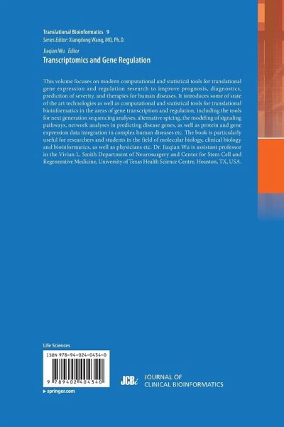 This volume focuses on modern computational and statistical tools for translational gene expression and regulation research to improve prognosis, diagnostics, prediction of severity, and therapies for human diseases. It introduces some of state of the art technologies as well as computational and statistical tools for translational bioinformatics in the areas of gene transcription and regulation, including the tools for next generation sequencing analyses, alternative spicing, the modeling of signaling pathways, network analyses in predicting disease genes, as well as protein and gene expression data integration in complex human diseases etc. The book is particularly useful for researchers and students in the field of molecular biology, clinical biology and bioinformatics, as well as physicians etc. Dr. Jiaqian Wu is assistant professor in the Vivian L. Smith Department of Neurosurgery and Center for Stem Cell and Regenerative Medicine, University of Texas Health Science Centre, Houston, TX, USA.