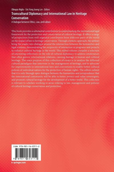 Preface.- Acknowledgement.- Introduction.- Chapter 1 Structure of the research.- Chapter 2 Transcultural diplomacy and international law.- PART I: HERITAGE AND CULTURE.- Chapter 3 Academic disciplines as Transcultural heritage: In defence of culture as cultivation.- Chapter 4 Octagon - The Quest for Wholeness.- Chapter 5 Ecclesiastical Heritage as Human Right.- Chapter 6 Curzio Malaparte's War Novels in Poland: Then and Now.- Chapter 7 A living heritage. The Villa E.1027 by the sea .- Chapter 8 Jitiya: Tharu Inherence to Eco-Culture.- Chapter 9 Importance and perspectives of natural heritage, in Romania.- Chapter 10 A relationship between Plants and their Hindu and Buddha cultures: An analysis Ficus religiosa (Pipal).- PART II: HERITAGE AND LAW.- Chapter 11 International Legal Instruments as a means for the protection of Cultural Heritage.- Chapter 12 International and European obligations to protect Cultural Heritage in Belgium.- Chapter 13 Cultural Heritage in International Law: (Still) Looking for a Definition? The Taxonomy of Cultural Heritage Across the Spectrum of UNESCO Conventions and Beyond.- Chapter 14 Traditional Cultural Expressions (TCEs), holder communities and conflicts with central States: policies for the recognition of intangible cultural heritage (ICH) and intellectual property (IP) regulation.- PART III: HERITAGE AND COMMUNITY.- Chapter 15 Cultural Diplomacy in India: Dispersal, Heritage Representation, Contestation and Development.- Chapter 16 Algeria and its heritage: Inventory of the various heritage policies, from the pre-colonial to colonial and post-colonial times