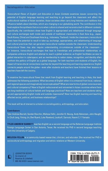 Preface Chapter 1: Introduction Tyler Barrett and Melissa Fellin Part 1: Mongolia, Thailand, and Indonesia Chapter 2: The transcultural role of English in the out-of-classroom linguascapes of EFL university students in Mongolia Sender Dovchin Chapter 3: Plurilingual competencies and the appropriation of English in the online discourse of Thai high school students Andy Halvorsen Chapter 4: Indonesian pre-service teachers' identities in a microteaching context: Learning to teach English in an Indonesian teacher education program Dwi Riyanti and Loukia Sarroub Part 2: China Chapter 5: Navigating the sanyu: English as a tool for success in a Confucian meritocratic imaginary Naomi C.F. Yamada Chapter 6: Behind China's English Fever: The Contested Discourses on English and People's Yearning for Social Mobility Yiming Jin Chapter 7: Leisure Time and English: Transnational Urban Consumption, World Citizenship, and the Embodiment of Language Jennifer D. Heung Chapter 8: Facilitating Transcultural Flows through Embodied Language Performance John Haught Part 3: Japan Chapter 9: Selections and deflections of English in Japan Luke Rowland Chapter 10: Perceptions of Japanese ethnic church-member parents teaching their children in Japanese in English-speaking Canadian contexts Tyler Barrett Part 4: South Korea Chapter 11: Global Friendship: Transcultural Experiences in South Korean Undergraduates' English Study Abroad In Chull Jang Chapter 12: Cultural Immersion and Authentic Relationships: The Complicated Relationships between Foreign English Teachers and Koreans in South Korea Melissa Fellin Chapter 13: Conclusion: The localization of English in Asian Contexts Melissa Fellin and Tyler Barrett