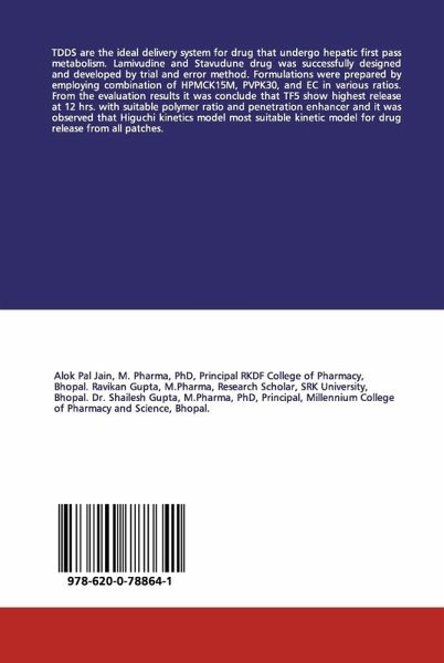 TDDS are the ideal delivery system for drug that undergo hepatic first pass metabolism. Lamivudine and Stavudune drug was successfully designed and developed by trial and error method. Formulations were prepared by employing combination of HPMCK15M, PVPK30, and EC in various ratios. From the evaluation results it was conclude that TF5 show highest release at 12 hrs. with suitable polymer ratio and penetration enhancer and it was observed that Higuchi kinetics model most suitable kinetic model for drug release from all patches.