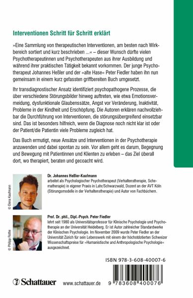 »Eine Sammlung von therapeutischen Interventionen, die mir den Zugang zu den Patienten erleichtern, am besten nach Wirkbereich sortiert und kurz beschrieben ...« - dieser Wunsch dürfte vielen Psychotherapeutinnen und Psychotherapeuten aus ihrer Ausbildung und während ihrer praktischen Tätigkeit bekannt vorkommen. Der junge Psychotherapeut Johannes B. Heßler und der renommierte »alte Hase« Peter Fiedler haben ihn nun gemeinsam in einem kurz gefassten »griffbereiten« Buch umgesetzt.