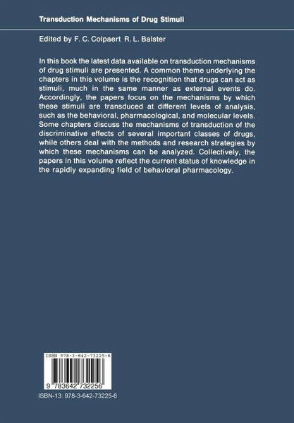 In this book the latest data available on transduction mechanisms of drug stimuli are presented. A common theme underlying the chapter in this volume is the recognition that drugs can act as stimuli, in much the same manner as external events do. Accordingly, the papers focus on the mechanisms by which these stimuli are transduced at different levels of analysis, such as the behavioral, pharmacological, and molecular levels. Some chapters discuss the mechanisms of transduction of the discriminative effects of several important classes of drugs, while others deal with the methods and research strategies by which these mechanisms can be analyzed. Collectively, the papers in this volume reflect the current status of knowledge in the rapidly expanding field of behavioral pharmacology.