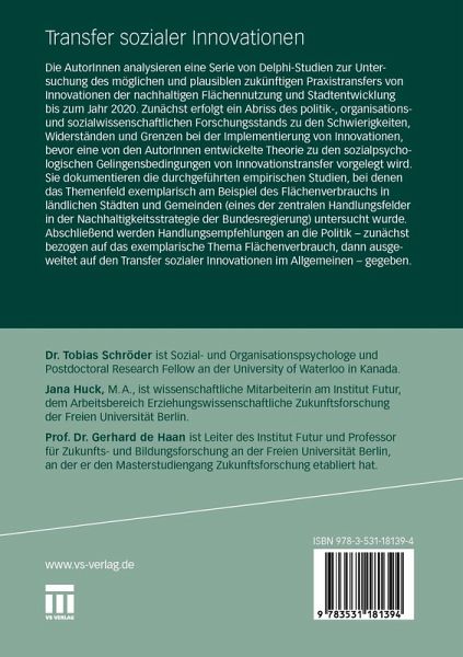 Die AutorInnen analysieren eine Serie von Delphi-Studien zur Untersuchung des möglichen und plausiblen zukünftigen Praxistransfers von Innovationen der nachhaltigen Flächennutzung und Stadtentwicklung bis zum Jahr 2020. Zunächst erfolgt ein Abriss des politik-, organisations- und sozialwissenschaftlichen Forschungsstands zu den Schwierigkeiten, Widerständen und Grenzen bei der Implementierung von Innovationen, bevor eine von den AutorInnen entwickelte Theorie zu den sozialpsychologischen Gelingensbedingungen von Innovationstransfer vorgelegt wird. Sie dokumentieren die durchgeführten empirischen Studien, bei denen das Themenfeld exemplarisch am Beispiel des Flächenverbrauchs in ländlichen Städten und Gemeinden (eines der zentralen Handlungsfelder in der Nachhaltigkeitsstrategie der Bundesregierung) untersucht wurde. Abschließend werden Handlungsempfehlungen an die Politik - zunächst bezogen auf das exemplarische Thema Flächenverbrauch, dann ausgeweitet auf den Transfer sozialer Innovationen im Allgemeinen - gegeben.