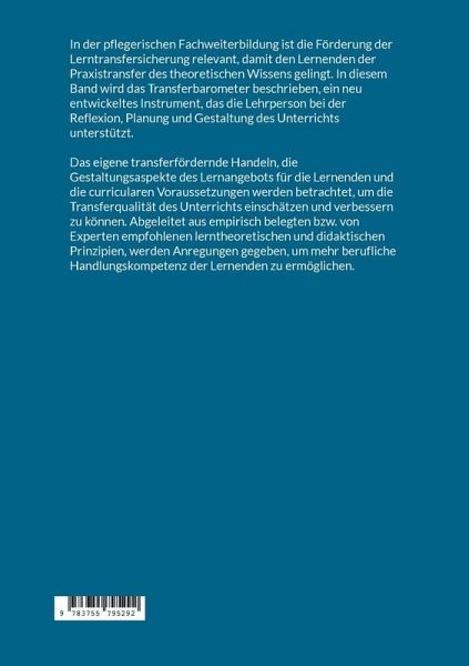 In der pflegerischen Fachweiterbildung ist die Förderung der Lerntransfersicherung relevant, damit den Lernenden der Praxistransfer des theoretischen Wissens gelingt. In diesem Band wird das Transferbarometer beschrieben, ein neu entwickeltes Instrument, das die Lehrperson bei der Reflexion, Planung und Gestaltung des Unterrichts unterstützt. Das eigene transferfördernde Handeln, die Gestaltungsaspekte des Lernangebots für die Lernenden und die curricularen Voraussetzungen werden betrachtet, um die Transferqualität des Unterrichts einschätzen und verbessern zu können. Abgeleitet aus empirisch belegten bzw. von Experten empfohlenen lerntheoretischen und didaktischen Prinzipien, werden Anregungen gegeben, um mehr berufliche Handlungskompetenz der Lernenden zu ermöglichen.