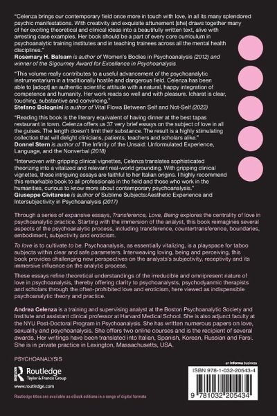 With Transference, Love, Being: Essential Essays from the Field, Andrea Celenza gives us a new chapter in her extraordinary journey in psychoanalysis. That it is rare and remarkable can be immediately guessed from the richness and variety of topics addressed with depth but without lengthy academicism. Interwoven with gripping clinical vignettes, Celenza translates sophisticated theorizing into a vitalized and relevant real-world grounding. Among the most intriguing essays: 'The historically fetishized couch', 'The inadvertent pluralist', 'Diffuse attentional set'... and then, again, 'The phenomenal experience of touch', 'To be in it with' and, somehow affirmative and liberatory '"Yes and..." dreams'. Faithful to her Italian origins, she offers the menu of an exceptional chef, extremely careful to combine the best of tradition with experimentation with new flavors and aromas. That there really is a bit of Mediterranean cuisine is immediately apparent from the word 'field' that significantly appears in the subtitle. Transference, Love, Being testifies to the vitality and creativity of the author and of psychoanalysis. I highly recommend this remarkable book to all professionals in the field of the treatment of mental suffering, but also to those who work in the humanities or who are curious to know more about contemporary psychoanalysis.