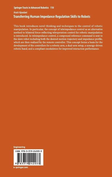 This book introduces novel thinking and techniques to the control of robotic manipulation. In particular, the concept of teleimpedance control as an alternative method to bilateral force-reflecting teleoperation control for robotic manipulation is introduced. In teleimpedance control, a compound reference command is sent to the slave robot including both the desired motion trajectory and impedance profile, which are then realized by the remote controller. This concept forms a basis for the development of the controllers for a robotic arm, a dual-arm setup, a synergy-driven robotic hand, and a compliant exoskeleton for improved interaction performance.