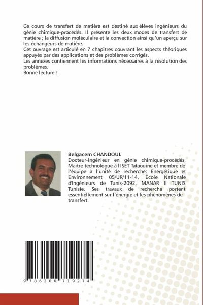 Ce cours de transfert de matière est destiné aux élèves ingénieurs du génie chimique-procédés. Il présente les deux modes de transfert de matière ; la diffusion moléculaire et la convection ainsi qu'un aperçu sur les échangeurs de matière. Cet ouvrage est articulé en 7 chapitres couvrant les aspects théoriques appuyés par des applications et des problèmes corrigés. Les annexes contiennent les informations nécessaires à la résolution des problèmes. Bonne lecture !