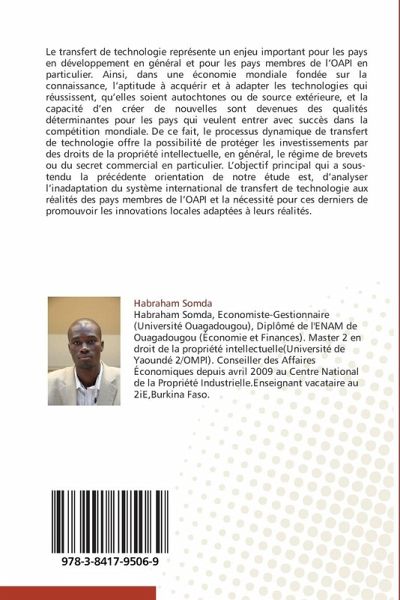 Le transfert de technologie représente un enjeu important pour les pays en développement en général et pour les pays membres de l OAPI en particulier. Ainsi, dans une économie mondiale fondée sur la connaissance, l aptitude à acquérir et à adapter les technologies qui réussissent, qu elles soient autochtones ou de source extérieure, et la capacité d en créer de nouvelles sont devenues des qualités déterminantes pour les pays qui veulent entrer avec succès dans la compétition mondiale. De ce fait, le processus dynamique de transfert de technologie offre la possibilité de protéger les investissements par des droits de la propriété intellectuelle, en général, le régime de brevets ou du secret commercial en particulier. L objectif principal qui a sous-tendu la précédente orientation de notre étude est, d analyser l inadaptation du système international de transfert de technologie aux réalités des pays membres de l OAPI et la nécessité pour ces derniers de promouvoir les innovations locales adaptées à leurs réalités.