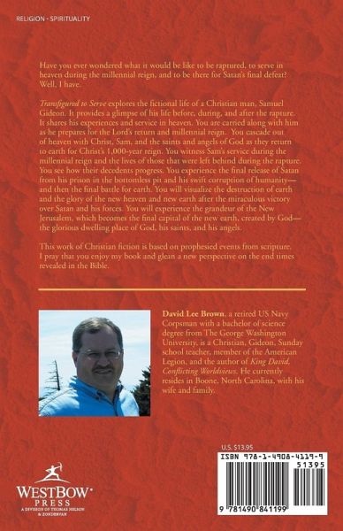 Have you ever wondered what it would be like to be raptured, to serve in heaven during the millennial reign, and to be there for Satan's final defeat? Well, I have. Transfigured to Serve explores the fictional life of a Christian man, Samuel Gideon. It provides a glimpse of his life before, during, and after the rapture. It shares his experiences and service in heaven. You are carried along with him as he prepares for the Lord's return and millennial reign. You cascade out of heaven with Christ, Sam, and the saints and angels of God as they return to earth for Christ's 1,000-year reign. You witness Sam's service during the millennial reign and the lives of those that were left behind during the rapture. You see how their decedents progress. You experience the final release of Satan from his prison in the bottomless pit and his swift corruption of humanity--and then the final battle for earth. You will visualize the destruction of earth and the glory of the new heaven and new earth after the miraculous victory over Satan and his forces. You will experience the grandeur of the New Jerusalem, which becomes the final capital of the new earth, created by God--the glorious dwelling place of God, his saints, and his angels. This work of Christian fiction is based on prophesied events from scripture. I pray that you enjoy my book and glean a new perspective on the end times revealed in the Bible.