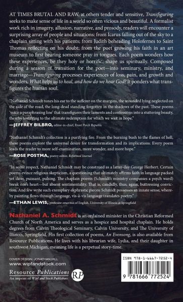 At times brutal and raw, at others tender and sensitive, Transfiguring seeks to make sense of life in a world so often vicious and beautiful. A formalist work rich in imagery, allusion, narrative, and prosody, readers will encounter a surprising array of people and situations: from Icarus falling out of the sky to a chaplain sitting with his patients; from Judith beheading Holofernes to Saint Thomas reflecting on his doubt; from the poet growing his faith in an art museum to first hearing someone pray in tongues. Each poem wonders how these experiences, be they holy or horrific, shape us spiritually. Composed during a season of transition for the poet--into seminary, ministry, and marriage--Transfiguring processes experiences of loss, pain, and growth and wonders, What helps us to heal, and how do we hear God? It ponders what transfigures the human soul.
