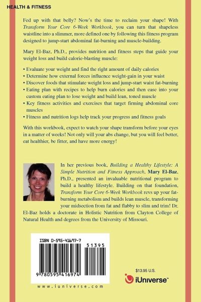 Fed up with that belly? Now's the time to reclaim your shape! With Transform Your Core 6-Week Workbook, you can turn that shapeless waistline into a slimmer, more defined one by following this fitness program designed to jump-start abdominal fat-burning and muscle-building. Mary El-Baz, Ph.D., provides nutrition and fitness steps that guide your weight loss and build calorie-blasting muscle: Evaluate your weight and find the right amount of daily calories Determine how external forces influence weight-gain in your waist Discover foods that stimulate weight loss and jump-start waist fat-burning Eating plan with recipes to help burn calories and then ease into your custom eating plan to lose weight and build lean, toned muscle Key fitness activities and exercises that target firming abdominal core muscles Fitness and nutrition logs help track your progress and fitness goals With this workbook, expect to watch your shape transform before your eyes in a matter of weeks! Not only will your abs change, but you will feel better, eat healthier, be fitter, have more energy!