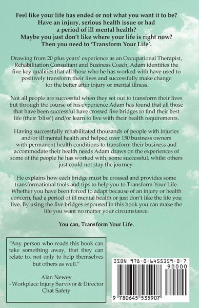 Feel like your life has ended or not what you want it to be? Have an injury, serious health issue or had a period of ill mental health? Maybe you just don't like where your life is right now? Then you need to 'Transform Your Life'. Drawing from 20 plus years' experience as an Occupational Therapist, Rehabilitation Consultant and Business Coach, Adam identifies the five key qualities that all those who he has worked with have used to positively transform their lives and successfully make change for the better after injury or mental illness. Not all people are successful when they set out to transform their lives but through the course of his experience Adam has found that all those that have been successful have crossed five bridges to find their best life (their 'bliss') and/or learn to live with their health requirements. Having successfully rehabilitated thousands of people with injuries and/or ill mental health and helped over 150 business owners with permanent health conditions to transform their business and accommodate their health needs Adam draws on the experiences of some of the people he has worked with. Some successful, whilst others just could not stay the journey. He explains how each bridge must be crossed and provides some transformational tools and tips to help you to Transform Your Life. Whether you have been forced to adapt because of an injury or health concern, had a period of ill mental health or just don't like the life you live. By using the five bridges espoused in this book you can make the life you want no matter your circumstance. You can, Transform Your Life.