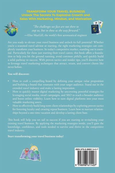 Are you ready to elevate your travel business and unlock its full potential? Whether you're a seasoned travel advisor or starting, the right marketing strategies can completely transform your business. In today's competitive market, standing out is essential. Especially for those launching their travel careers, this book provides a rock-solid foundation to help you avoid common pitfalls and fast-track your path to success. With proven tactics and easy-to-implement tactics, you'll learn how to leverage marketing techniques that attract, retain, and convert clients like never before. Inside, you'll discover how to:Craft a compelling brand that defines your value and resonates with your dream clients Master digital marketing, including social media, email campaigns, and SEO Build long-term client relationships that turn first-time travelers into loyal fans Whether you are starting from scratch or revitalizing your travel business, this book will give you the tools, confidence, and mindset needed to succeed in the travel industry. Start transforming your travel business today.