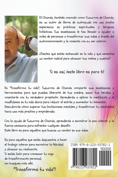 Transforma Tu Vida: Descubre el poder del crecimiento personal y vive una vida plena. En este libro, encontrará las herramientas necesarias para llevar a cabo una transformación profunda en su vida. A través de 15 capítulos, explorarás distintos temas como la autoestima, la gestión emocional, la ley de la atracción y la importancia de la acción, entre otros. Cada capítulo incluye ejercicios prácticos, reflexiones y consejos para ayudarte a aplicar los conceptos a tu propia vida. Desde la primera página, este libro te invita a hacer una introspección profunda ya tomar acción para mejorar tu vida. Aprenderás a aceptar la incertidumbre, manejar tus emociones y superar el miedo al fracaso. También descubrirás cómo practicar mindfulness y la gratitud para vivir en el momento presente y apreciar las bendiciones de tu vida. Susurros de Chamán, es un autor de libros de autoayuda con una amplia experiencia en prácticas espirituales y terapias holísticas. Sus enseñanzas le han llevado a ayudar a miles de personas a transformar sus vidas a través del autoconocimiento y la conexión con su ser interior.
