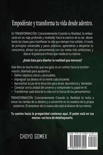 Empoderate y transforma tu vida desde adentro. En TRANSFORMACIÓN: Conscientemente Creando tu Realidad, te embarcarás en un viaje profundo y revelador hacia la esencia de tu ser, desvelando las claves para manifestar la vida que siempre has soñado. A través de principios universales y pasos prácticos, aprenderás a despertar tu consciencia, alinear tus pensamientos con tus metas más ambiciosas, y liberar el potencial infinito que reside en tu interior. ¿Estás lista para diseñar la realidad que mereces? Este libro es mucho más que una guía; es un camino hacia la transfor- mación, diseñado para ayudarte a:Definir objetivos claros y alcanzables. Impregnar tus deseos en la mente subconsciente. Aprovechar la Ley de la Atracción para atraer abundancia y bienestar. Conectar con la unidad del universo y comprender tu papel en él. Transformar cada área de tu vida con la fuerza de tus pensamientos. TRANSFORMACIÓN: Conscientemente Creando tu Realidad te invita a tomar las riendas de tu destino y a convertirte en la creadora de tu propia existencia. El amanecer de tu nueva vida está al alcance de tus manos. Tu camino hacia la prosperidad comienza aquí. El poder está en tus manos-es hora de desbloquearlo.