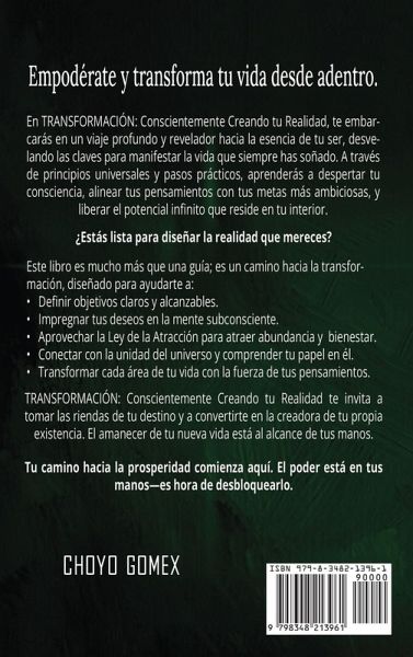 Empoderate y transforma tu vida desde adentro. En TRANSFORMACIÓN: Conscientemente Creando tu Realidad, te embarcarás en un viaje profundo y revelador hacia la esencia de tu ser, desvelando las claves para manifestar la vida que siempre has soñado. A través de principios universales y pasos prácticos, aprenderás a despertar tu consciencia, alinear tus pensamientos con tus metas más ambiciosas, y liberar el potencial infinito que reside en tu interior. ¿Estás lista para diseñar la realidad que mereces? Este libro es mucho más que una guía; es un camino hacia la transfor- mación, diseñado para ayudarte a:Definir objetivos claros y alcanzables. Impregnar tus deseos en la mente subconsciente. Aprovechar la Ley de la Atracción para atraer abundancia y bienestar. Conectar con la unidad del universo y comprender tu papel en él. Transformar cada área de tu vida con la fuerza de tus pensamientos. TRANSFORMACIÓN: Conscientemente Creando tu Realidad te invita a tomar las riendas de tu destino y a convertirte en la creadora de tu propia existencia. El amanecer de tu nueva vida está al alcance de tus manos. Tu camino hacia la prosperidad comienza aquí. El poder está en tus manos-es hora de desbloquearlo.