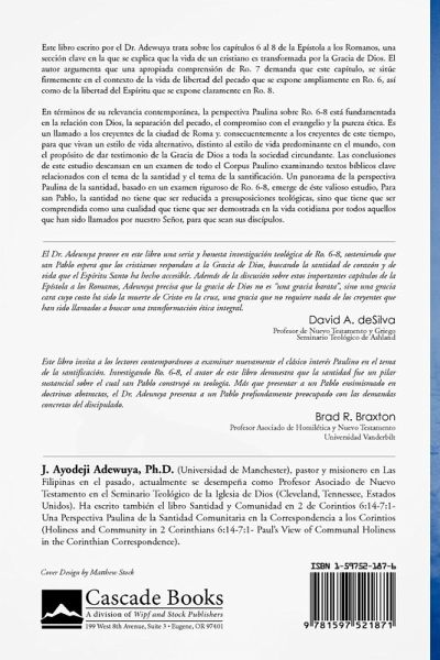 Este libro escrito por el Dr. Adewuya trata sobre los capitulos 6 al 8 de la Epistola a los Romanos, una seccion clave en la que se explica que la vida de un cristiano es transformada por la Gracia de Dios. El autor argumenta que una apropiada comprension de Ro. 7 demanda que este capitulo, se situe firmemente en el contexto de la vida de libertad del pecado que se expone ampliamente en Ro. 6, asi como de la libertad del Espiritu que se expone claramente en Ro. 8. En terminos de su relevancia contemporanea, la perspectiva Paulina sobre Ro. 6-8 esta fundamentada en la relacion con Dios, la separacion del pecado, el compromiso con el evangelio y la pureza etica. Es un llamado a los creyentes de la ciudad de Roma y. consecuentemente a los creyentes de este tiempo, para que vivan un estilo de vida alternativo, distinto al estilo de vida predominante en el mundo, con el proposito de dar testimonio de la Gracia de Dios a toda la sociedad circundante. Las conclusiones de este estudio descansan en un examen de todo el Corpus Paulino examinando textos biblicos clave relacionados con el tema de la santidad y el tema de la santificacion. Un panorama de la perspectiva Paulina de la santidad, basado en un examen riguroso de Ro. 6-8, emerge de este valioso estudio, Para san Pablo, la santidad no tiene que ser reducida a presuposiciones teologicas, sino que tiene que ser comprendida como una cualidad que tiene que ser demostrada en la vida cotidiana por todos aquellos que han sido llamados por nuestro Senor, para que sean sus discipulos.