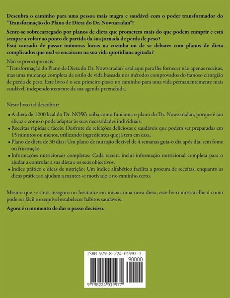 Descubra o caminho para uma pessoa mais magra e saudável com o poder transformador do "Transformação do Plano de Dieta do Dr. Nowzaradan"! Sente-se sobrecarregado por planos de dieta que prometem mais do que podem cumprir e está sempre a voltar ao ponto de partida da sua jornada de perda de peso? Está cansado de passar inúmeras horas na cozinha ou de se debater com planos de dieta complicados que mal se encaixam na sua vida quotidiana agitada? Não se preocupe mais! "Transformação do Plano de Dieta do Dr. Nowzaradan" está aqui para lhe fornecer não apenas receitas, mas uma mudança completa de estilo de vida baseada nos métodos comprovados do famoso cirurgião de perda de peso. Este livro é o seu primeiro passo no caminho para uma vida permanentemente mais saudável, independentemente da sua agenda preenchida. Neste livro irá descobrir:A dieta de 1200 kcal do Dr. NOW: saiba como funciona o plano do Dr. Nowzaradan, porque é tão eficaz e como o pode adaptar às suas necessidades individuais. Receitas rápidas e fáceis: Desfrute de refeições deliciosas e saudáveis que podem ser preparadas em 15 minutos ou menos, utilizando ingredientes que já tem em casa. Plano de dieta de 30 dias: Um plano de nutrição flexível de 4 semanas guia-o dia após dia, sem fome ou frustração. Informações nutricionais completas: Cada receita inclui informação nutricional completa para o ajudar a controlar a sua dieta e os seus objectivos. Índice prático e dicas de nutrição: Um índice alfabético facilita a procura de receitas, enquanto as dicas práticas o ajudam a manter-se motivado e no caminho certo. Mesmo que se sinta inseguro ou hesitante em iniciar uma nova dieta, este livro mostrar-lhe-á como pode ser fácil e exequível estabelecer hábitos saudáveis. Agora é o momento de dar o passo decisivo.