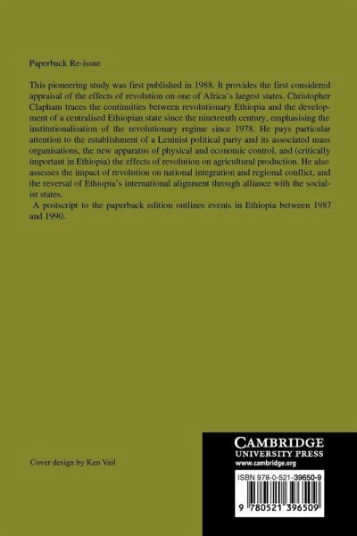 This pioneering study was first published in 1988. It examines the effects of revolution on one of Africa's largest states. Christopher Clapham traces the continuities between revolutionary Ethiopia and the development of a centralised Ethiopian state since the nineteenth century, emphasising the institutionalisation of the revolutionary regime since 1978. He pays particular attention to the establishment of a Leninist political party and its associated mass organisations, the new apparatus of physical and economic control, and - critically important in Ethiopia - the effects of revolution on agricultural production. He also assesses the impact of revolution on national integration and regional conflict, and the reversal of Ethiopia's international alignment through alliance with the socialist states. A postscript to the paperback edition outlines events in Ethiopia between 1987 and 1990.