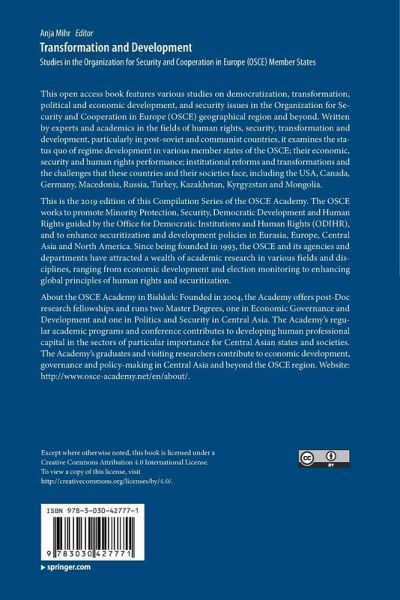 This open access book features various studies on democratization, transformation, political and economic development, and security issues in the Organization for Security and Cooperation in Europe (OSCE) geographical region and beyond. Written by experts and academics in the fields of human rights, security, transformation and development, particularly in post-soviet and communist countries, it examines the status quo of regime development in various member states of the OSCE; their economic, security and human rights performance; institutional reforms and transformations and the challenges that these countries and their societies face, including the USA, Canada, Germany, Macedonia, Russia, Turkey, Kazakhstan, Kyrgyzstan and Mongolia.
