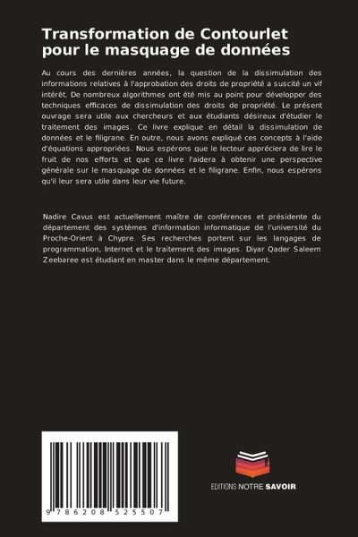 Au cours des dernières années, la question de la dissimulation des informations relatives à l'approbation des droits de propriété a suscité un vif intérêt. De nombreux algorithmes ont été mis au point pour développer des techniques efficaces de dissimulation des droits de propriété. Le présent ouvrage sera utile aux chercheurs et aux étudiants désireux d'étudier le traitement des images. Ce livre explique en détail la dissimulation de données et le filigrane. En outre, nous avons expliqué ces concepts à l'aide d'équations appropriées. Nous espérons que le lecteur appréciera de lire le fruit de nos efforts et que ce livre l'aidera à obtenir une perspective générale sur le masquage de données et le filigrane. Enfin, nous espérons qu'il leur sera utile dans leur vie future.