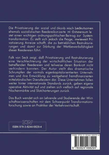Die Privatisierung der sozial und ökonomisch bedeutsamen ehemals sozialistischen Reedereikonzerne im Ostseeraum leistet einen wichtigen ordnungspolitischen Beitrag zur Systemtransformation. Es stellt sich jedoch die Frage, inwieweit Privatisierung Anreize schafft, die zu betrieblichen Restrukturierungen und damit zur Stärkung der Wettbewerbsfähigkeit dieser Reedereien führt. Falk von Seck zeigt, daß Privatisierung und Restrukturierung eine Verschlechterung der wirtschaftlichen Situation der betreffenden Reedereien und teilweise deren Bankrott nicht verhindern konnten. Der Autor stellt das dramatische Schrumpfen der vormals eigenkapitalorientierten Unternehmen und ihre Entwicklung zu weitgehend fremdfinanzierten mittelständischen Dienstleistern dar. Diese Unternehmen fallen weiter hinter internationale Standards zurück, geben eigene operative Aktivität auf und ziehen sich vielfach auf regionale Nischenmärkte und Slotcharterungen zurück.