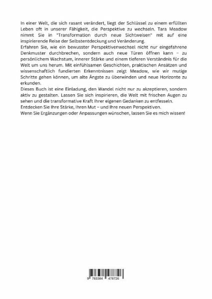 In einer Welt, die sich rasant verändert, liegt der Schlüssel zu einem erfüllten Leben oft in unserer Fähigkeit, die Perspektive zu wechseln. Tara Meadow nimmt Sie in "Transformation durch neue Sichtweisen" mit auf eine inspirierende Reise der Selbstentdeckung und Veränderung.Erfahren Sie, wie ein bewusster Perspektivenwechsel nicht nur eingefahrene Denkmuster durchbrechen, sondern auch neue Türen öffnen kann - zu persönlichem Wachstum, innerer Stärke und einem tieferen Verständnis für die Welt um uns herum. Mit einfühl-samen Geschichten, praktischen Ansätzen und wissenschaftlich fundierten Erkenntnissen zeigt Meadow, wie wir mutige Schritte gehen können, um alte Ängste zu überwinden und neue Horizonte zu erkunden.Dieses Buch ist eine Einladung, den Wandel nicht nur zu akzeptieren, sondern aktiv zu gestalten. Lassen Sie sich inspirieren, die Welt mit frischen Augen zu sehen und die transformative Kraft Ihrer eigenen Gedanken zu entfesseln.Entdecken Sie Ihre Stärke, Ihren Mut - und Ihre neuen Perspektiven.