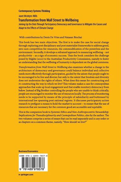 Transformation from Wall Street to Well-being: Joining up the dots through Participatory democracy and governance to mitigate the causes and adapt to the effects of climate change addresses accountable leadership, supports collective interests, ethical governance and fairness to future generations in order to develop systemic approaches relevant to these issues. The humanistic focus, whilst central, addresses how we see ourselves in relation to the environment. It explores cultural perspectives in developed and developing parts of the world where people have a closer connection with the natural environment in comparison to those who live in cities. Furthermore the book discusses participatory action research to prefigure a means to hold the market to ensure that the use of resources that are necessary for the common good are accessible and equitable. The essential systemic aim this book offers is to balance human needs with nature. The research summarizes the discourses and the adaptive praxis in order to develop a bridge between cosmopolitan ethics and cosmopolitan governance. It does this in the interest of supporting and using cultural designs for living that support quality of life and spans five core domains as explained by the author. Overall, this monograph helps evaluates the extent to which the introduced approaches enable the community to consider their perceived assets and risks and the implications of their consumption choices.