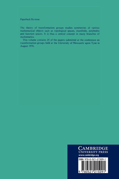 The theory of transformation groups studies symmetries of various mathematical objects such as topological spaces, manifolds, polyhedra and function spaces. It is thus a central concept in many branches of mathematics. This volume contains 25 of the papers submitted at the conference on transformation groups held at the University of Newcastle upon Tyne in August 1976.