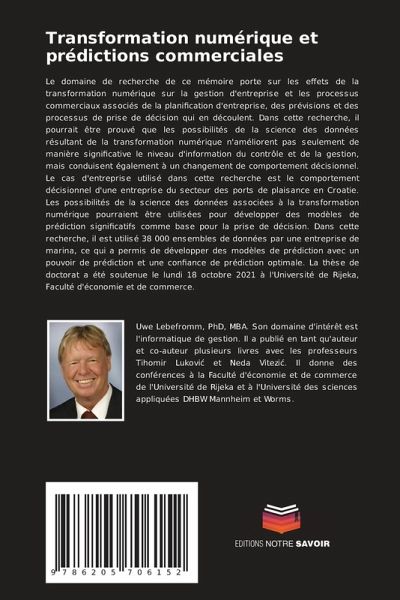 Le domaine de recherche de ce mémoire porte sur les effets de la transformation numérique sur la gestion d'entreprise et les processus commerciaux associés de la planification d'entreprise, des prévisions et des processus de prise de décision qui en découlent. Dans cette recherche, il pourrait être prouvé que les possibilités de la science des données résultant de la transformation numérique n'améliorent pas seulement de manière significative le niveau d'information du contrôle et de la gestion, mais conduisent également à un changement de comportement décisionnel. Le cas d'entreprise utilisé dans cette recherche est le comportement décisionnel d'une entreprise du secteur des ports de plaisance en Croatie. Les possibilités de la science des données associées à la transformation numérique pourraient être utilisées pour développer des modèles de prédiction significatifs comme base pour la prise de décision. Dans cette recherche, il est utilisé 38 000 ensembles de données par une entreprise de marina, ce qui a permis de développer des modèles de prédiction avec un pouvoir de prédiction et une confiance de prédiction optimale. La thèse de doctorat a été soutenue le lundi 18 octobre 2021 à l'Université de Rijeka, Faculté d'économie et de commerce.