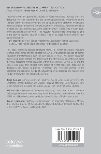 This book examines several emerging trends in higher education, including artificial intelligence and the impact the COVID-19 pandemic has had on higher education transformation over the past couple of years. All higher education leaders and policy makers are dealing with the aftermath and continuing battle they face regarding higher education within the context of COVID-19. AI and the 4IR are also areas that impact every aspect of higher education, especially as disciplines are forced to provide credentials and relevance aligned to the workforce and economic needs. The chapters provide regional and country case studies from within the Asia Pacific Region.