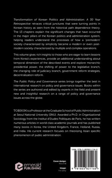 Transformation of Korean Politics and Administration: A 30 Year Retrospective retraces critical turning points in Korean history as seen from the historical path dependence theory to help explain the significant changes that have occurred in the major pillars of the Korean politics and administration.