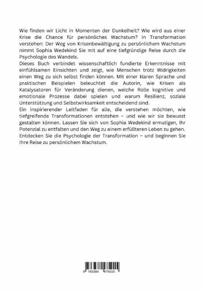 Wie finden wir Licht in Momenten der Dunkelheit? Wie wird aus einer Krise die Chance für persönliches Wachstum? In Transformation verstehen: Der Weg von Krisenbewältigung zu persönlichem Wachstum nimmt Sophia Wedekind Sie mit auf eine tiefgründige Reise durch die Psychologie des Wandels.Dieses Buch verbindet wissenschaftlich fundierte Erkenntnisse mit einfühlsamen Ein-sichten und zeigt, wie Menschen trotz Widrigkeiten einen Weg zu sich selbst finden können. Mit einer klaren Sprache und praktischen Beispielen beleuchtet die Autorin, wie Krisen als Katalysatoren für Veränderung dienen, welche Rolle kognitive und emotionale Prozesse dabei spielen und warum Resilienz, soziale Unterstützung und Selbstwirksamkeit entscheidend sind.Ein inspirierender Leitfaden für alle, die verstehen möchten, wie tiefgreifende Transformationen entstehen - und wie wir sie bewusst gestalten können. Lassen Sie sich von Sophia Wedekind ermutigen, Ihr Potenzial zu entfalten und den Weg zu einem erfüllteren Leben zu gehen.Entdecken Sie die Psychologie der Transformation - und beginnen Sie Ihre Reise zu persönlichem Wachstum.