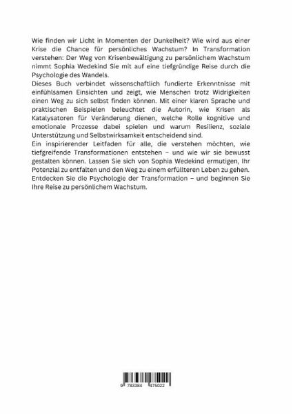 Wie finden wir Licht in Momenten der Dunkelheit? Wie wird aus einer Krise die Chance für persönliches Wachstum? In Transformation verstehen: Der Weg von Krisenbewältigung zu persönlichem Wachstum nimmt Sophia Wedekind Sie mit auf eine tiefgründige Reise durch die Psychologie des Wandels.Dieses Buch verbindet wissenschaftlich fundierte Erkenntnisse mit einfühlsamen Ein-sichten und zeigt, wie Menschen trotz Widrigkeiten einen Weg zu sich selbst finden können. Mit einer klaren Sprache und praktischen Beispielen beleuchtet die Autorin, wie Krisen als Katalysatoren für Veränderung dienen, welche Rolle kognitive und emotionale Prozesse dabei spielen und warum Resilienz, soziale Unterstützung und Selbstwirksamkeit entscheidend sind.Ein inspirierender Leitfaden für alle, die verstehen möchten, wie tiefgreifende Transformationen entstehen - und wie wir sie bewusst gestalten können. Lassen Sie sich von Sophia Wedekind ermutigen, Ihr Potenzial zu entfalten und den Weg zu einem erfüllteren Leben zu gehen.Entdecken Sie die Psychologie der Transformation - und beginnen Sie Ihre Reise zu persönlichem Wachstum.