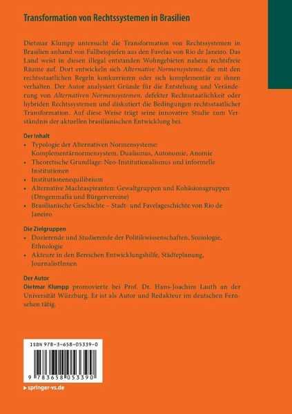 Dietmar Klumpp untersucht die Transformation von Rechtssystemen in Brasilien anhand von Fallbeispielen aus den Favelas von Rio de Janeiro. Das Land weist in diesen illegal entstandenen Wohngebieten nahezu rechtsfreie Räume auf. Dort entwickeln sich Alternative Normensysteme, die mit den rechtsstaatlichen Regeln konkurrieren oder sich komplementär zu ihnen verhalten. Der Autor analysiert Gründe für die Entstehung und Veränderung von Alternativen Normensystemen, defekter Rechtsstaatlichkeit oder hybriden Rechtssystemen und diskutiert die Bedingungen rechtsstaatlicher Transformation. Auf diese Weise trägt seine innovative Studie zum Verständnis der aktuellen brasilianischen Entwicklung bei.