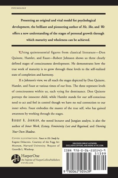 Presenting an original and vital model for psychological development, the brilliant and pioneering author of He, She, and We offers a new understanding of the stages of personal growth through which maturity and wholeness can be achieved. Using quintessential figures from classical literature--Don Quixote, Hamlet, and Faust--Robert Johnson shows us three clearly defined stages of consciousness development. He demonstrates how the true work of maturity is to grow through these levels to the self-realized state of completion and harmony. In Johnson's view, we all reach the stages depicted by Don Quixote, Hamlet, and Faust at various times of our lives. The three represent levels of consciousness within us, each vying for dominance. Don Quixote portrays the innocent child, while Hamlet stands for our self-conscious need to act and feel in control though we have no real connection to our inner selves. Faust embodies the master of the true self, who has gained awareness by working through the stages.