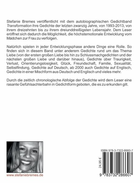 Stefanie Bremes veröffentlicht mit dem autobiographischen Gedichtband "Transformation" ihre Gedichte der letzten zwanzig Jahre, von 1993-2013, von ihrem dreizehnten bis zu ihrem dreiunddreißigsten Lebensjahr. Dem Leser eröffnet sich durch das Lesen der chronologisch angeordneten Gedichte die Möglichkeit, die emotionale Entwicklung vom Mädchen zur Frau zu verfolgen.