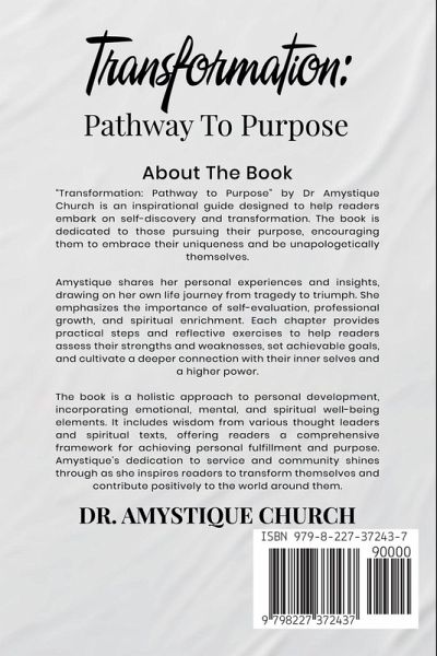 "Transformation: Pathway to Purpose" by Dr Amystique Church is an inspirational guide designed to help readers embark on self-discovery and transformation. The book is dedicated to those pursuing their purpose, encouraging them to embrace their uniqueness and be unapologetically themselves. Amystique shares her personal experiences and insights, drawing on her own life journey from tragedy to triumph. She emphasizes the importance of self-evaluation, professional growth, and spiritual enrichment. Each chapter provides practical steps and reflective exercises to help readers assess their strengths and weaknesses, set achievable goals, and cultivate a deeper connection with their inner selves and a higher power. The book is a holistic approach to personal development, incorporating emotional, mental, and spiritual well-being elements. It includes wisdom from various thought leaders and spiritual texts, offering readers a comprehensive framework for achieving personal fulfillment and purpose. Amystique's dedication to service and community shines through as she inspires readers to transform themselves and contribute positively to the world around them.