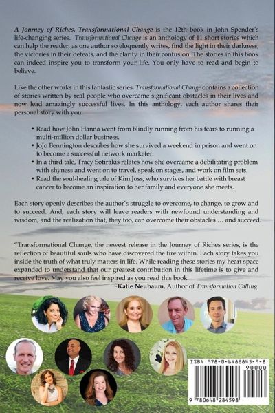 A Journey of Riches, Transformational Change is the 12th book in John Spender's life-changing series. Transformational Change is an anthology of 11 short stories which can help the reader, as one author so eloquently writes, find the light in their darkness, the victories in their defeats, and the clarity in their confusion. The stories in this book can indeed inspire you to transform your life. You only have to read and begin to believe. A Journey of Riches: Transformational Change Like the other works in this fantastic series, Transformational Change contains a collection of stories written by real people who overcame significant obstacles in their lives and now lead amazingly successful lives. In this anthology, each author shares their personal story with you. Regardless of whatever you're currently facing in your life, there's a plethora of tools and tactics you can use to overcome any situation and make your life richer. Among the powerful insights contained in this life-changing book are: Read how John Hanna went from blindly running from his fears to running a multi-million dollar business. JoJo Bennington describes how she survived a term in prison and went on to become a successful seven-figure network marketer. In a third tale, Tracy Sotirakis relates how she overcame a debilitating problem with shyness and went on to travel, speak on stages, and work on film sets. Read the soul-healing tale of Kim Joss, who survives her battle with breast cancer to become an inspiration to her family and everyone she meets. How to move to another country when you don't know the language. And much more! Each story openly describes the author's struggle to overcome, to change, to grow and to succeed. And, each story will leave readers with newfound understanding and wisdom, and the realization that, you too, can overcome your obstacles … and succeed. Praise for A Journey of Riches series: "A Journey of Riches Series is a must read. It is an empowering collection of inspirational and moving stories full of courage, strength, and heart. Bringing peace & awareness to those lucky enough to read to assist and inspire them on their life journey." Gemma Castiglia, Avalon Healing, Best Selling Author. "A must-read for anyone facing major changes or challenges in life right now. This book will give you the courage to move through any challenge with confidence, grace, and ease." ~ Jo-Anne Irwin, Transformational Coach & Bestselling Author. "Transformational Change, the newest release in the Journey of Riches series, is the reflection of beautiful souls who have discovered the fire within. Each story takes you inside the truth of what truly matters in life. While reading these stories, my heart space expanded to understand that our greatest contribution in this lifetime is to give and receive love. May you also feel inspired as you read this book." ~Katie Neubaum, Author of Transformation Calling. "A Journey of Riches series will draw you in and help you dig deep into your soul. Every author has an unbelievable life story of purpose inside of them. John Spender is dedicated to bringing peace, love, and adventure to the world of his readers! Dive into this series, and you will be transformed!!" ~ Jeana Matichak, Author of Finding Peace. Contributing Authors in this volume: John Spender, John Hanna, JoJo Bennington, Tracy Sotirakis, Tom Wind, Mia Tolis, Stephen Smith, Kim Joss, Elli Petrovska, Sandy Escabi, Nikki Galagher. A Journey of Riches: Transformational Change, If you're curious about what it takes to transform your life, then you need to get your hands on this book now! Scroll up and click the button to get started today!