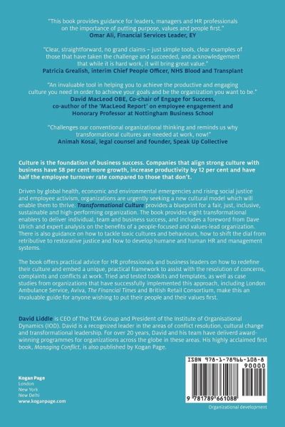 Driven by global health, economic and environmental emergencies and rising social justice and employee activism, organizations are urgently seeking a new cultural model which will enable them to thrive. Transformational Culture provides a blueprint for a fair, just, inclusive, sustainable, and high performing organization. With a foreword from Dave Ulrich and expert analysis of the benefits of a people-focused and values lead organization, it provides 8 transformational enablers to deliver individual, team and business success. Guidance is also included on how to tackle toxic cultures and behaviours, how to shift the dial from retributive to restorative justice, and how to develop humane and human HR and management systems.