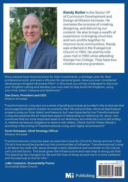 How would God have us live in relationship to our time, talents, testimony, and treasure? Should Christians work simply to increase the amount of stuff that we have, or does God have a higher purpose-a Kingdom purpose-for our finances? How about for our lives? Transformational Living: Discover Your Kingdom Assignment is the result of many years of study, reflection, and implementation by Dr. Randy R. Butler. A longtime pastor, Bible student, and historian, Butler brings a wealth of insight into why God has made people with specific abilities, spheres of influence, and stewardship responsibilities. Written at a lay-level, but with an eye to the learned, Transformational Living will help any Christian grow in their knowledge of God, but especially those who are interested in how God can use their possessions. Transformational Living will not make you feel guilty about what you have; it will make you feel better about allowing God to be in charge of it. In helping readers understand their Kingdom Assignment, Butler reveals the oft-overlooked religious principles in the lives of five famous industrialists: Andrew Carnegie, Henry Ford, J.P. Morgan, John D. Rockefeller, Sr., and Cornelius Vanderbilt. He then shows how Christians today, who might never have access to the amount of capital as these famous men, yet may honor God and help others by how they use their possessions for God's kingdom purposes.