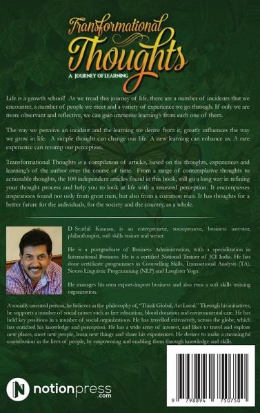 Life is a growth school! As we tread this journey of life, there are a number of incidents that we encounter, a number of people we meet and a variety of experience we go through. If only we are more observant and reflective, we can gain immense learning's from each one of them. The way we perceive an incident and the learning we derive from it, greatly influences the way we grow in life. A simple thought can change our life. A new learning can enhance us. A rare experience can revamp our perception. Transformational Thoughts is a compilation of articles, based on the thoughts, experiences and learning's of the author over the course of time. From a range of contemplative thoughts to actionable thoughts, the 100 independent articles found in this book, will go a long way in refining your thought process and help you to look at life with a renewed perception. It encompasses inspirations found not only from great men, but also from a common man. It has thoughts for a better future for the individuals, for the society and the country, as a whole.