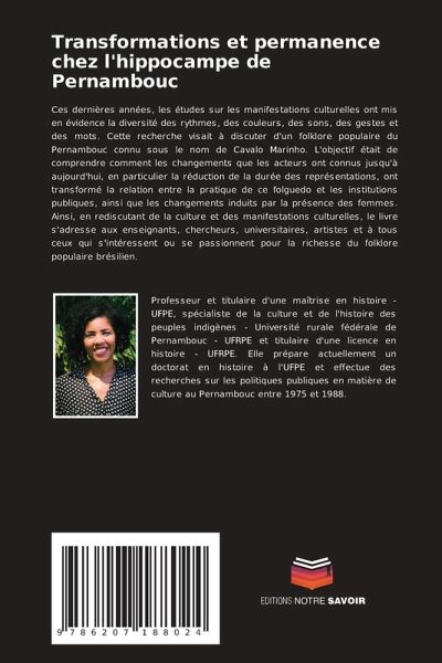 Ces dernières années, les études sur les manifestations culturelles ont mis en évidence la diversité des rythmes, des couleurs, des sons, des gestes et des mots. Cette recherche visait à discuter d'un folklore populaire du Pernambouc connu sous le nom de Cavalo Marinho. L'objectif était de comprendre comment les changements que les acteurs ont connus jusqu'à aujourd'hui, en particulier la réduction de la durée des représentations, ont transformé la relation entre la pratique de ce folguedo et les institutions publiques, ainsi que les changements induits par la présence des femmes. Ainsi, en rediscutant de la culture et des manifestations culturelles, le livre s'adresse aux enseignants, chercheurs, universitaires, artistes et à tous ceux qui s'intéressent ou se passionnent pour la richesse du folklore populaire brésilien.
