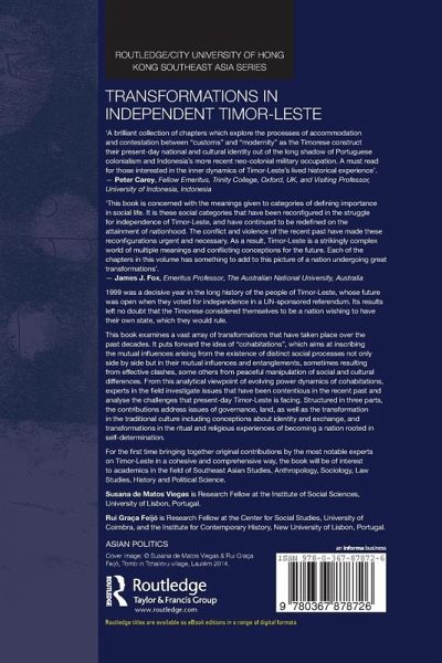 Introduction: exploring cohabitations in Timor-Leste Susana de Matos and Rui Graça Feijó Part I Contexts for a "revival of custom" 1. Returning to origin places in an expanding world: customary ritual in independent Timor-Leste Elisabeth G. Traube 2. Hunting and harvesting in the commons: on the cultural politics of custom Andrew McWilliam 3. The re-assertion of sacralised authority in post-occupation Uato-Lari Susana Barnes 4. Territorialities of the fallen heroes Susana de Matos Viegas and Rui Graça Feijó Part II Land and territory 5. The challenges of establishing a land tenure system in a newly independent state Dionisio Babo Soares 6. Navigating without a compass: state transition in Timor-Leste's formal land tenure system Bernardo Almeida 7. Reconceptualizing land and territory in Oecusse Ambeno's enclave's special economic zone Laura S. Meitzner Yoder 8. Exchange, water and motif in an etic genre of narrative David Hicks Part III Governance and democracy 9. An ecology of governance: rethinking the state and political community M. Anne Brown and Damian Grenfell 10. Managing persons and rituals: economic pedagogy as government tactics Kelly Silva 11. Local administration: a view from Vemasse Michael Leach 12. At home we wear cawat, outside we wear a tie: cohabitation and political legitimacy in grass-roots democracy Rui Graça Feijó 13. Conflict resolution and the making of personhood in Lisadila, Maubara Daniel S. Simião